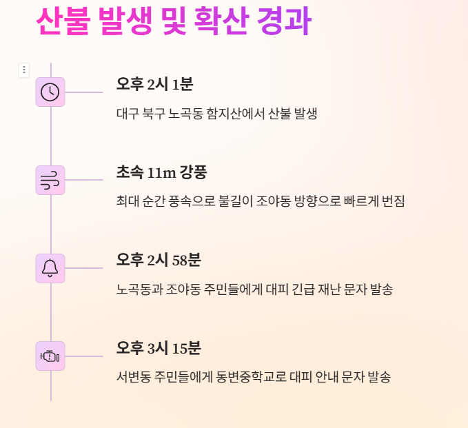 산불은 2025년 4월 28일 오후 2시 1분경 대구 북구 노곡동 함지산에서 시작되었습니다. 산림당국에 따르면 당시 평균 풍속은 초속 3m였으나 최대 순간 풍속이 초속 11m에 달하는 강풍이 불면서 불길이 빠르게 인근 조야동 방향으로 번졌습니다. 산불 발생 약 20분 만에 도심 곳곳에서 연기가 목격되었으며 주민들은 탄내와 함께 불길이 보이기 시작했다고 전했습니다. 화재 현장에서는 강풍으로 인해 불똥이 날아가는 비화 현상이 관찰되어 진화 작업에 어려움을 더했습니다.