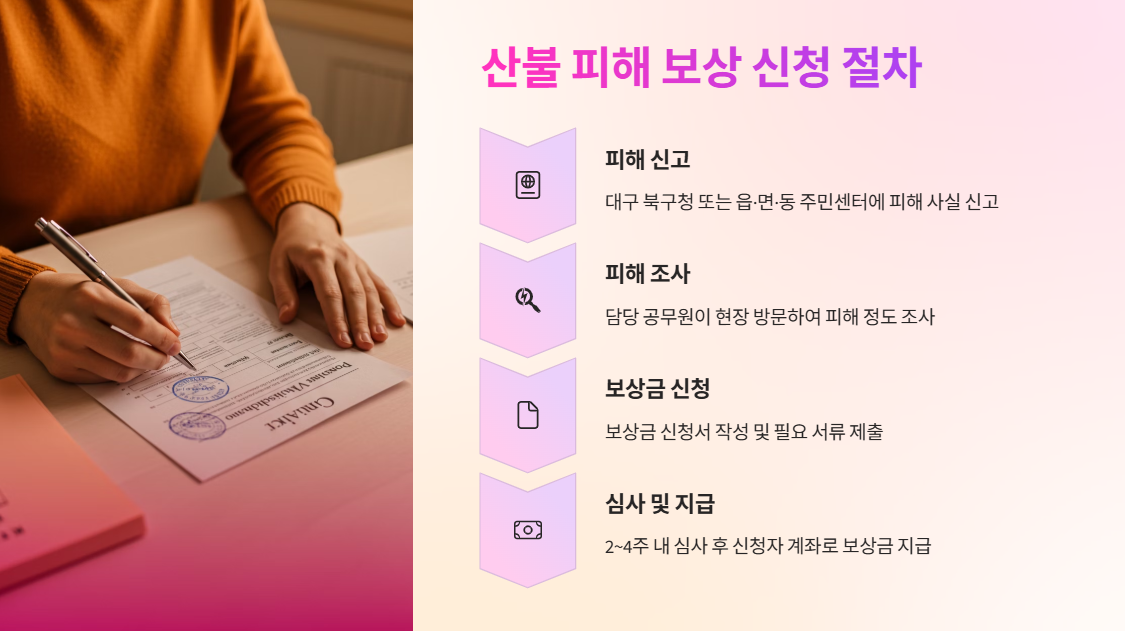 산불 피해 발생 후 가장 먼저 관할 지자체인 대구 북구청 또는 읍·면·동 주민센터에 피해 사실을 신고해야 합니다. 신고 시에는 피해 상황을 증명할 수 있는 사진, 동영상, 또는 기타 증빙 자료를 제출하는 것이 좋습니다. 북구청 환경관리과(전화 053-665-4205~8)로 문의하시면 상세한 안내를 받으실 수 있습니다. - 피해 조사