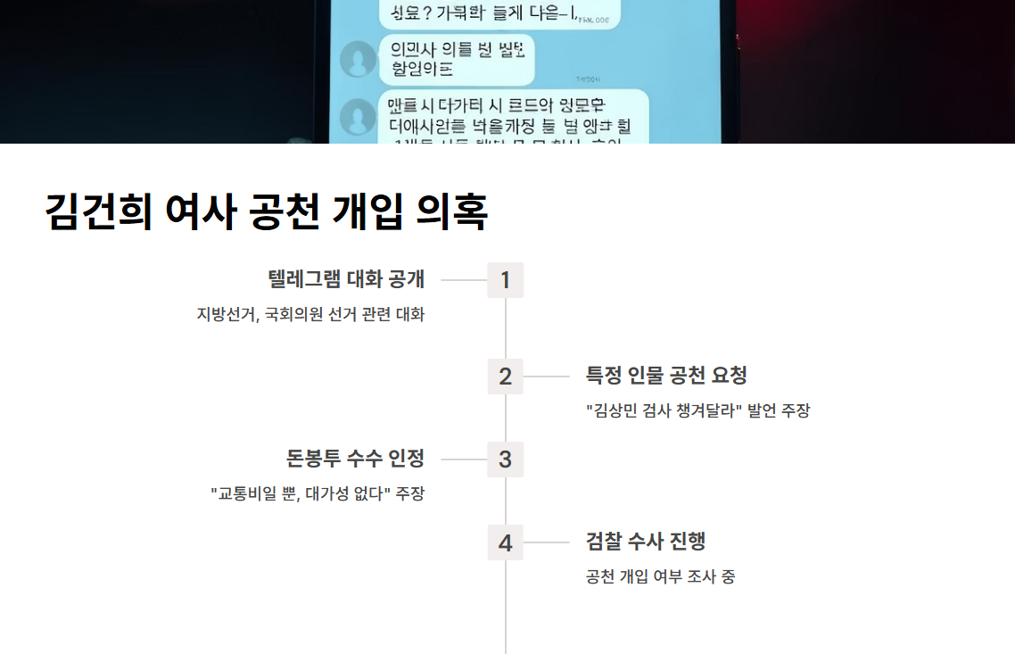 검찰은 명태균의 주장과 관련해 김건희 여사의 공천 개입 여부를 조사 중입니다. 명태균은 자신이 돈봉투를 받은 사실을 인정했으나, 이는 “교통비”일 뿐 대가성이 없다고 주장했습니다.