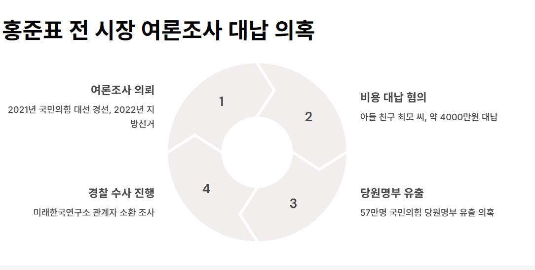 홍준표 전 대구시장도 명태균과 연관된 여론조사 조작 및 비용 대납 의혹으로 수사 대상에 올랐습니다. 2021년 국민의힘 대선 경선과 2022년 지방선거 당시 홍 전 시장은 명태균에게 여론조사를 의뢰하고, 그의 아들 친구인 최모 씨가 약 4000만 원의 비용을 대납했다는 혐의를 받고 있습니다.