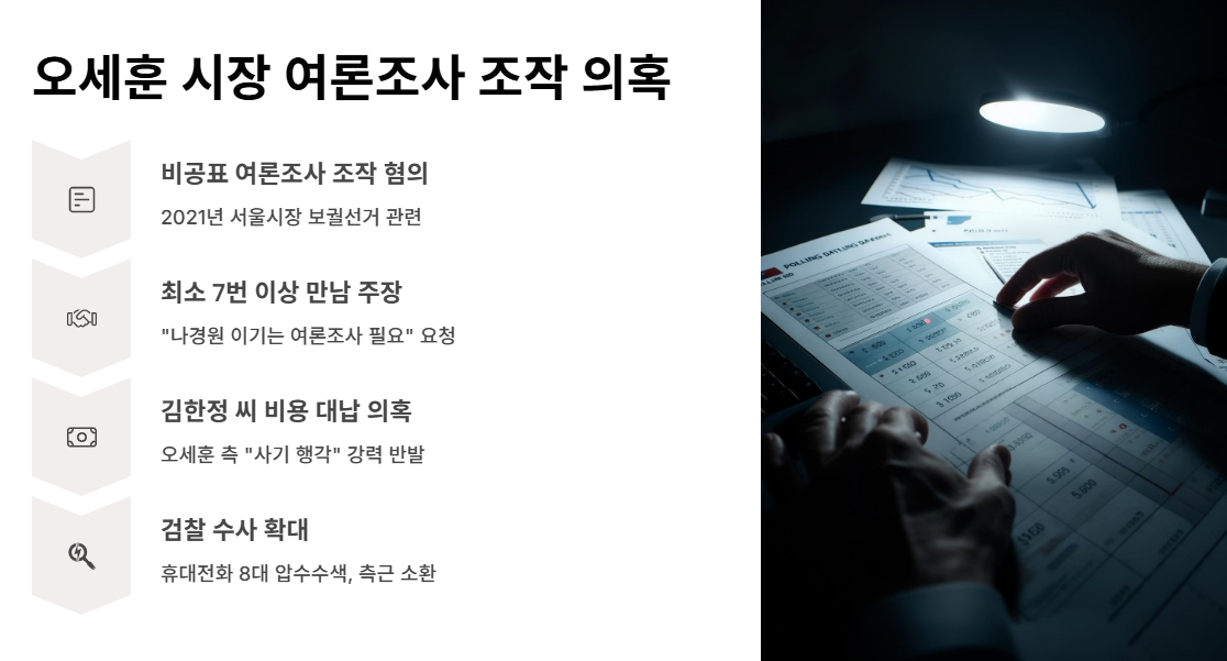 검찰은 오세훈 시장의 휴대전화 8대를 압수수색하고, 측근인 강철원 정무부시장과 전광삼 대통령실 시민사회수석 등을 소환 조사하며 이 의혹의 실체를 파헤치고 있습니다.