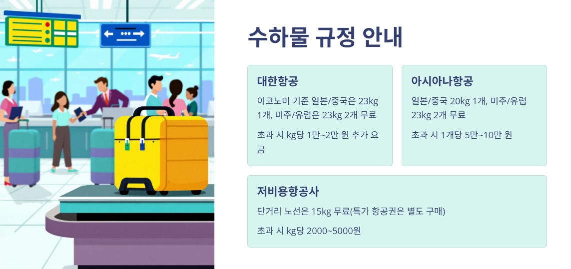 - 아시아나항공: 일본/중국 20kg 1개, 미주/유럽 23kg 2개 무료. 초과 시 1개당 5만~10만 원.